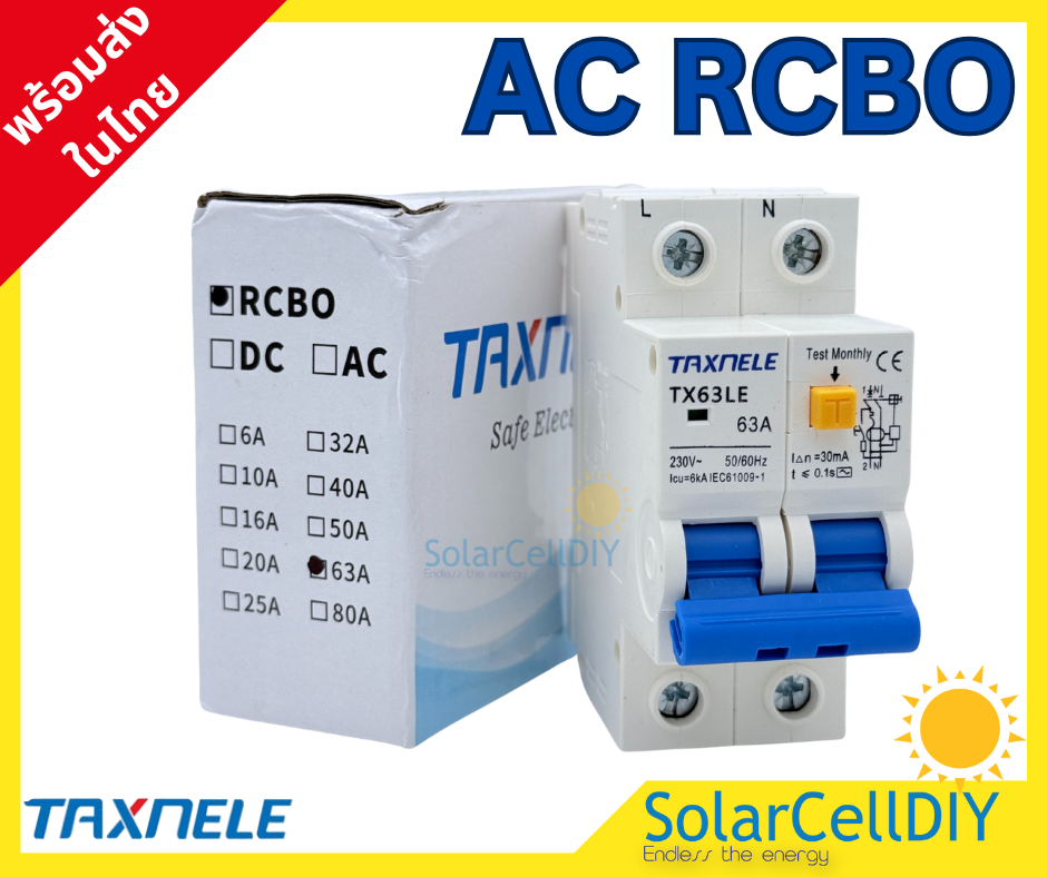 เบรกเกอร์กันดูด (RCBO) ชนิด 2 Pole ขนาด 63A มีปุ่ม เปิด-ปิด การทำงานกันดูด